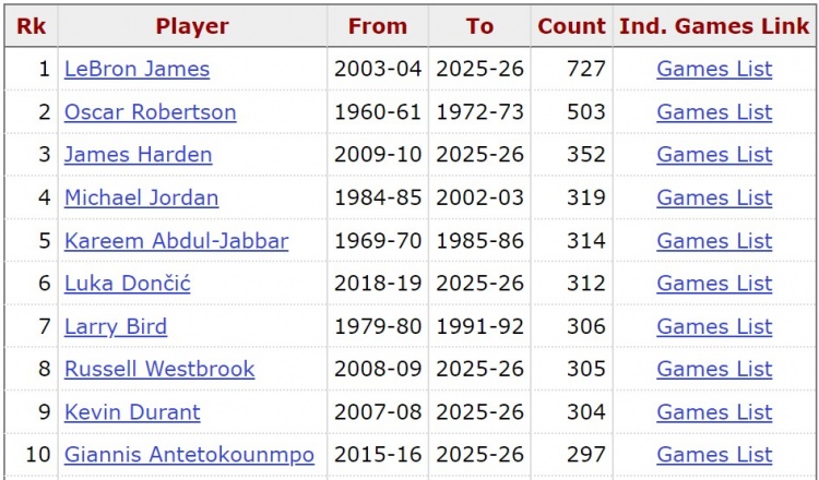 根据数据统计,这是杜兰特职业生涯第305场得到至少25+5+5,他追平威少,并列NBA历史25+5+5场次榜第8位。